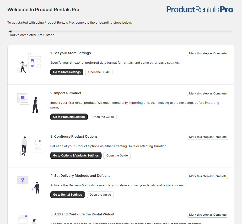 On your first open of Product Rentals Pro, you'll be taken to an installation screen for approximately 2-10 seconds, whilst we set up your account for first use. Once that's done, you'll be taken to our Onboarding checklist, which looks like image below.