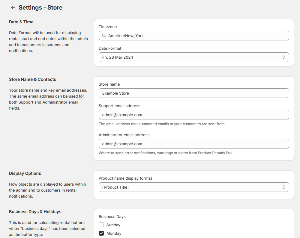 The **Store Settings** screen allows you save settings related to your store and your Product Rentals Pro system. A description of each setting available on this screen is below.